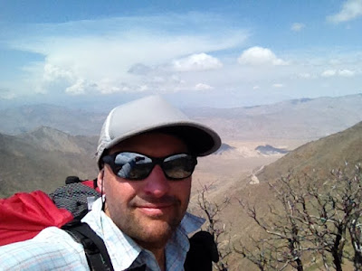 The weather was also dramatic. There is a bit of a storm system moving through the area, and since we were walking along the abrupt eastern edge of this big hunk of mountain, the clouds were piling up to the west of us as the storm climbed in elevation, then right when the clouds got overhead they would disappear as that condensed air poured over the eastern scarp of the mountain and the water it was carrying re-vaporized. Occasionally when the wind ceased for a moment the hot breath of the desert below would blow up to our height and remind us what we're in for soon.